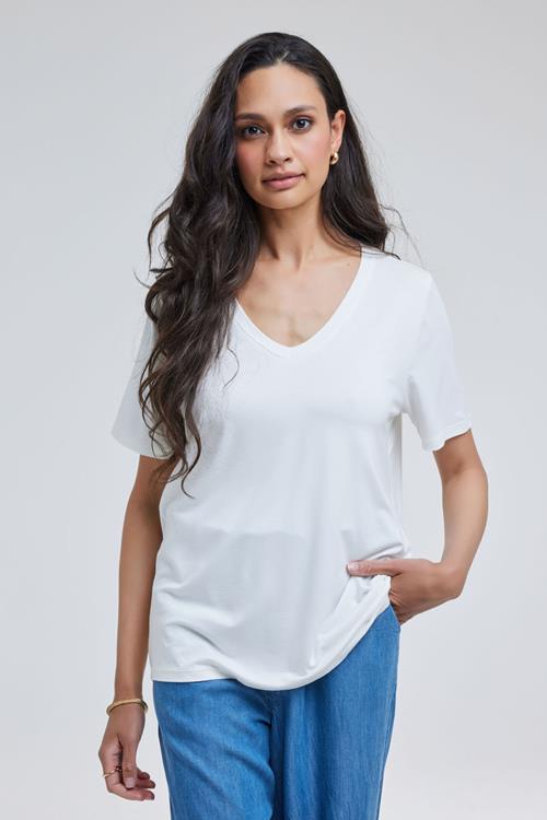 T-shirt Daily Offwhite: Tijdloze Stijl Het T-shirt Daily Offwhite is de perfecte mix van comfort en stijl die je elke dag het hele jaar door kunt dragen. De zachte witte kleur en de korte mouwen geven een frisse uitstraling. Dankzij de regular fit en rechte pasvorm voelt het T-shirt aangenaam aan. De V-hals is subtiel en zorgt voor een elegante touch die ideaal is om te combineren. Laat de veelzijdigheid van dit T-shirt je dagelijkse favoriet worden. Gemaakt van hoogwaardige stof Met 95% viscose en 5% elasthan biedt dit T-shirt het beste van beide werelden. De viscose zorgt voor een zijdezachte stof die fijn aanvoelt op je huid, terwijl de elasthan voor een uitstekende pasvorm zorgt. Deze combinatie maakt het T-shirt ademend en licht elastisch, zodat je ervan kunt genieten tijdens elke gelegenheid. Stijladvies Dit T-shirt is de ideale basis voor talloze outfits. Combineer het met een mooie jeans voor een casual look die altijd werkt. Of je nu thuis ontspant of een dagje uit gaat, met het T-shirt Daily Offwhite zie je er altijd stijlvol uit. Wasvoorschrift Wassen: Was het T-shirt op 30 graden om de kwaliteit van de stof te behouden. Droogvoorschrift: Vermijd de droger om krimp en slijtage te voorkomen. Strijkvoorschrift: Strijk op een lage temperatuur voor een perfect glad resultaat zonder de stof te beschadigen. Vermijd bleken en chemisch reinigen om de kleur en textuur van het T-shirt te behouden. Met het T-shirt Daily Offwhite voeg je een veelzijdig en comfortabel item toe aan je collectie dat geschikt is voor elk seizoen.