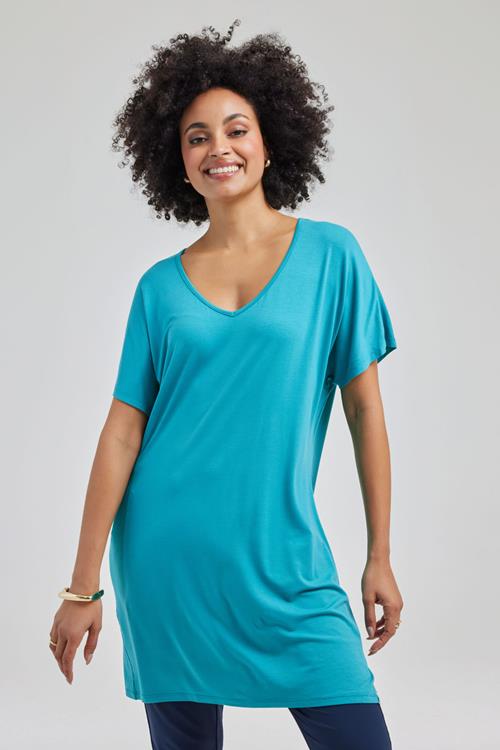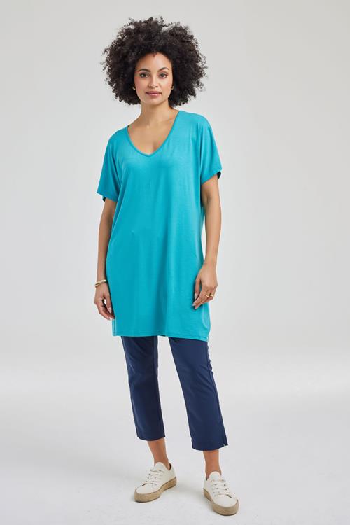 T-shirt Isa in Dark turquoise: Jouw Stijlvolle Keuze Met de T-shirt Isa in Dark turquoise kies je voor tijdloze elegantie. Dit korte mouw T-shirt, in een prachtige blauwe tint, is perfect om je op elk moment fris en stijlvol te voelen. Het rechtvallende, loose-fit model met een flatterende V-hals geeft je een comfortabele maar toch stijlvolle uitstraling. Perfect voor elke gelegenheid en moeiteloos te combineren binnen je garderobe. Gemaakt van hoogwaardige stof De T-shirt Isa is vervaardigd van 95% Vorteks viscose en 5% Elasthan. Deze combinatie zorgt voor een aangename, soepele stof die comfortabel aanvoelt op de huid. Vorteks viscose staat bekend om zijn ademende eigenschappen, ideaal voor warmere dagen, terwijl het Elasthan net dat beetje extra stretch biedt. Hierdoor behoud je de hele dag door een aangename bewegingsvrijheid. Stijladvies Deze veelzijdige T-shirt Isa in Dark turquoise kan je met allerlei stijlen combineren. Draag het casual met een paar sneakers, of geef je outfit meer flair met elegante accessoires. Het T-shirt staat ook prachtig op een mooie jeans. Zo creëer je eenvoudig een tijdloze look die altijd werkt. Wasvoorschrift Wasvoorschrift: Was het T-shirt binnenstebuiten op een zacht programma op maximaal 30 graden om de kwaliteit van de stof te behouden. Droogvoorschrift: Laat het liggend drogen, vermijd direct zonlicht om verkleuring tegen te gaan. Strijkvoorschrift: Strijken kan op een lage temperatuur voor een glad en netjes resultaat. Met deze tips houd je de T-shirt Isa in Dark turquoise in topconditie, waardoor je er nog lange tijd van kunt genieten.