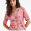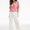 T-shirt Preppy Brava print: Jouw Nieuwe Favoriet Laat je betoveren door het T-shirt Preppy Brava print in een prachtige roze kleur, dat zich perfect leent voor zonnige dagen. Het casual, losse model met korte mouwen en een stijlvolle V-hals zorgt voor een moeiteloos elegante look, waarbij het elastiek in de zoom een speels detail toevoegt. Dit T-shirt is ideaal om je comfortabel en toch modieus te voelen, waar je ook bent. Gemaakt van Hoogwaardige Stof Het T-shirt Preppy Brava print is vervaardigd uit 96% viscose en 4% elasthan, waardoor het zacht en soepel aanvoelt op de huid. De combinatie van deze materialen zorgt ervoor dat het T-shirt zijn vorm behoudt, zelfs na meerdere keren dragen. De stof is ademend en licht, ideaal voor warme, zonnige dagen waarop je iets luchtigs wilt dragen. Stijladvies Dit veelzijdige T-shirt staat prachtig boven een stijlvolle jeans, voor een casual ensemble dat zowel binnen als buiten indruk maakt. De roze kleur en subtiele print maken het eenvoudig te combineren met verschillende accessoires, zodat je gemakkelijk je eigen draai kunt geven aan je outfit. Wasvoorschrift Wassen: Houd je T-shirt in topconditie door het te wassen op 30 graden. Dit behoudt de kleur en vorm van de stof. Droogvoorschrift: Het T-shirt is niet geschikt voor de droger. Laat het liever op een vlakke ondergrond drogen om vervorming te voorkomen. Strijkvoorschrift: Strijk je T-shirt op lage temperatuur om de zachte textuur te behouden en kreukels voorzichtig te verwijderen. Geniet van het comfort en de stijl van het T-shirt Preppy Brava print en maak het een essentiële aanvulling op je zomerse garderobe.