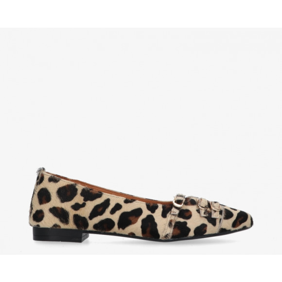 Ballerina van het merk Tango. Deze opvallende flat is uitgevoerd in leer met een trendy luipaardprint in warme bruin- en beigetinten. De puntige neus en dubbele bandjes met goudkleurige gespen geven het model een elegante en speelse twist. Dankzij de lage hak en zachte binnenvoering zit deze instapper ook nog eens heerlijk comfortabel.