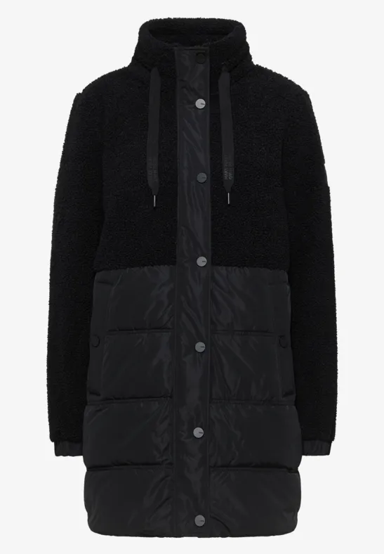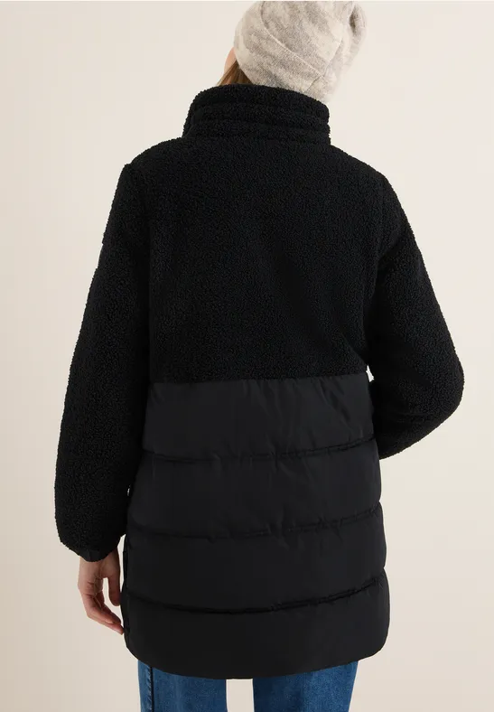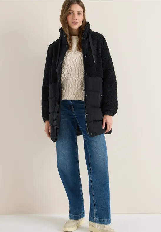 Dit teddyjack van CECIL voor dames zal je bekoren met zijn moderne structuurmix en zachte voering. Een capuchon met trekkoord, opgestikte zakken met fleecevoering en een praktische borstzak met ritssluiting zorgen voor warmte en functionaliteit. Metalen details voegen stijlvolle accenten toe en maken dit jack tot een favoriet voor koude dagen.