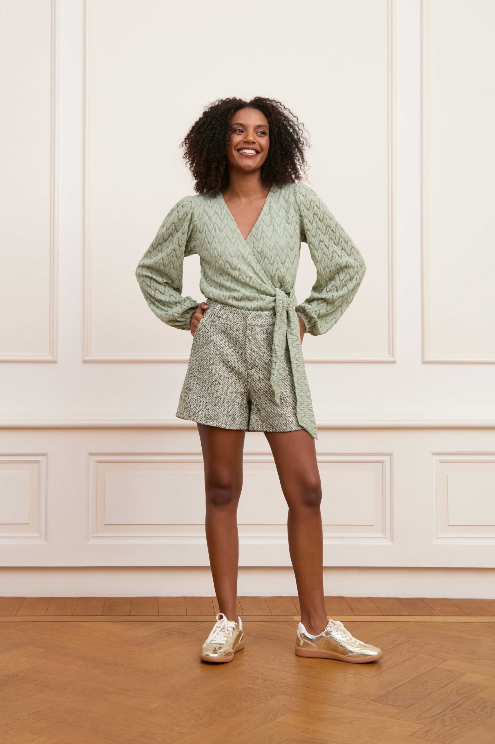 Materiaal: 90% polyester, 10% elastaan Model en fit: Het model is 1.74m en draagt maat S. De maat valt normaal Lengte top: 53 cm bij maat S Top Soline is een groene wrap top met patroon die je aan de linkerkant kunt knopen. De aangesloten top heeft een overslag, elastiek bij de mouwuiteinden en bevat veel stretch.