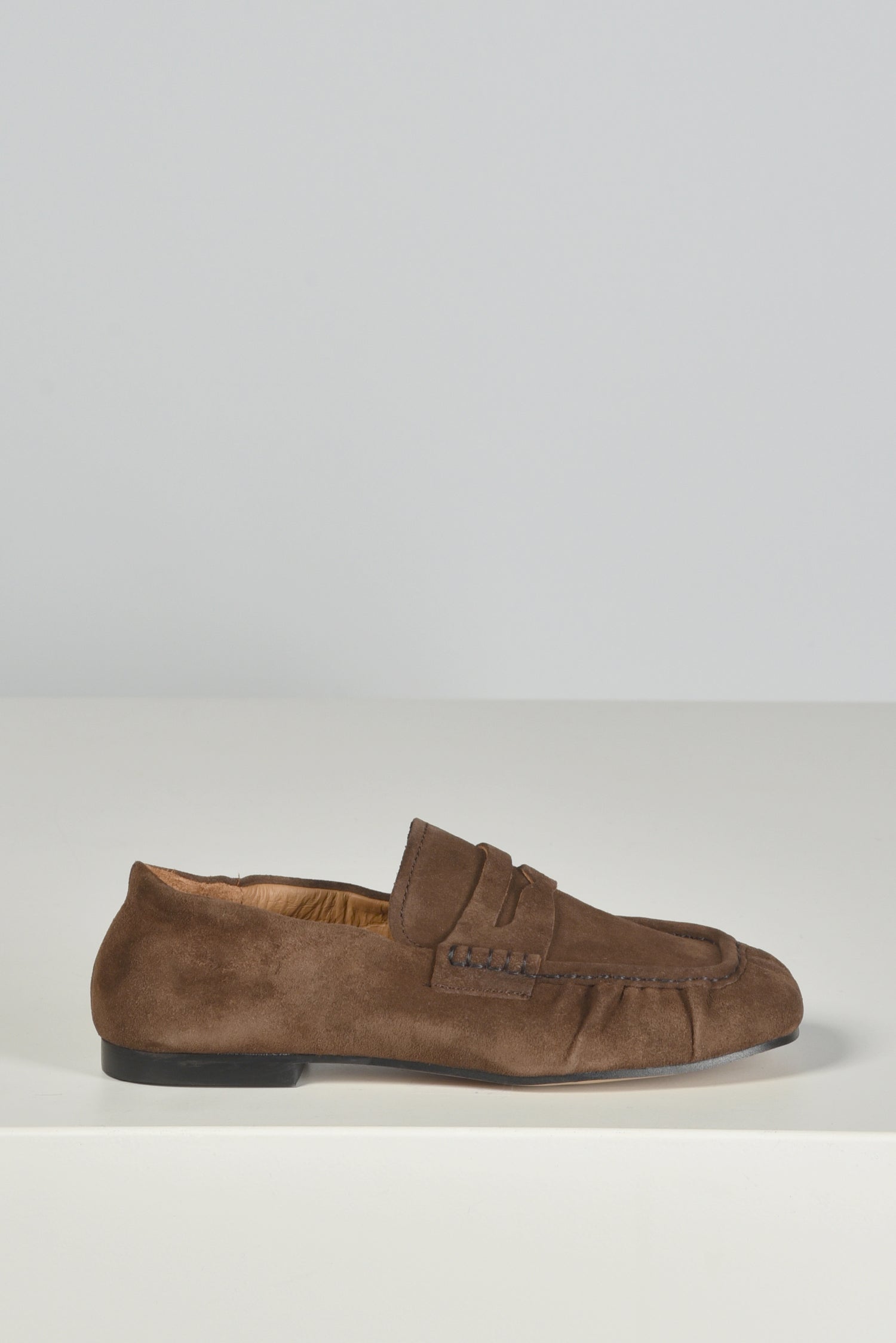 Dit zijn de suede loafers TL-PENY in bruin van Toral. De mocassinvorm valt meteen op, met de matte textuur en de stevige mocassinstiksels langs de randen. De flap op de wreef geeft het model een duidelijke lijnenstructuur, terwijl de zwarte platte zool het geheel licht houdt. Het suede voelt zacht aan en vormt soepel rond de voet. Ze vallen normaal op maat. Toral staat bekend om schoenen met heldere vormen en mooie materialen, en dat zie je hier direct terug.