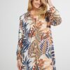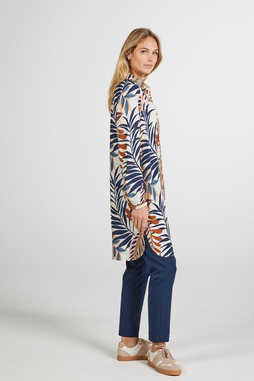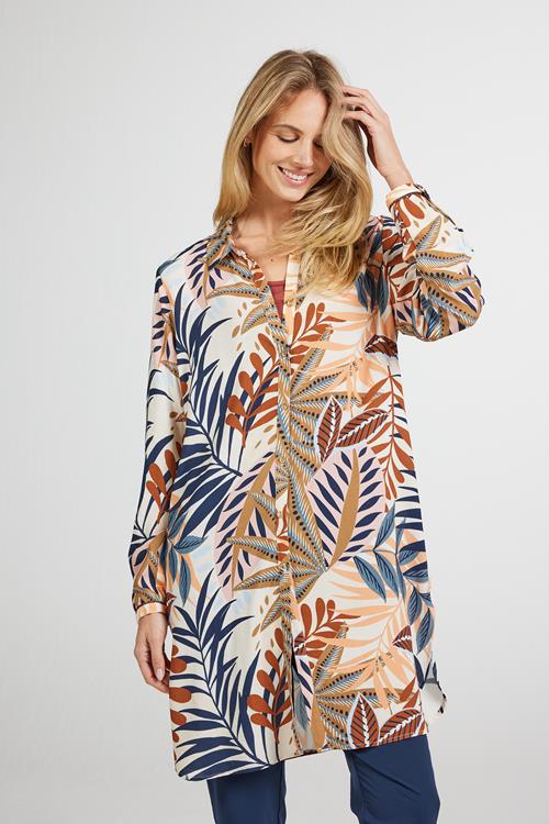 Stralend met de Tunic Delfine Springtime print De Tunic Delfine Springtime print is hét kledingstuk dat jouw frisse voorjaarsstijl benadrukt. Deze tuniek is uitgevoerd in een prachtige beige en bruine print, perfect voor een luchtige en opgewekte uitstraling. Met de reguliere pasvorm en rechte snit biedt deze tuniek niet alleen comfort, maar ook een verfijnde look. De driekwart mouwen zijn handig om op te rollen, waardoor je speelsheid aan je look toevoegt. De klassieke kraag en de praktische knoopsluiting maken het ontwerp compleet en veelzijdig voor iedere gelegenheid. Gemaakt van hoogwaardige stof Gemaakt van 100% viscose, biedt de Tunic Delfine Springtime print een lichte en zachte touch op je huid, ideaal voor warmer weer. Viscose is ademend en neemt vocht goed op, waardoor het de perfecte stof is om de hele dag fris te blijven. Daarnaast zorgt het ervoor dat de kleuren van de print helder blijven, zelfs na meerdere wasbeurten. Stijladvies Combineer deze tuniek met een strakke jeans of een casual legging voor een moeiteloze, stijlvolle look. De print doet het werk voor je, waardoor je accessoires minimalistisch kunt houden. Een paar eenvoudige oorbellen en sandalen maken je outfit helemaal af. Voor een iets formelere uitstraling, style met een elegante broek en hakken. Wasvoorschrift Wassen: Was je tuniek op 30 graden om de kwaliteit van het viscose te behouden. Droogvoorschrift: Niet geschikt voor de droger. Hang de tuniek op om natuurlijk te drogen, wat ook kreuken helpt te voorkomen. Strijkvoorschrift: Strijk op lage temperatuur om de stof in topconditie te houden, en voorkom het gebruik van direct contact met hete oppervlakken. Door deze eenvoudige onderhoudsinstructies te volgen, blijft je Tunic Delfine Springtime print er als nieuw uitzien, was na was.