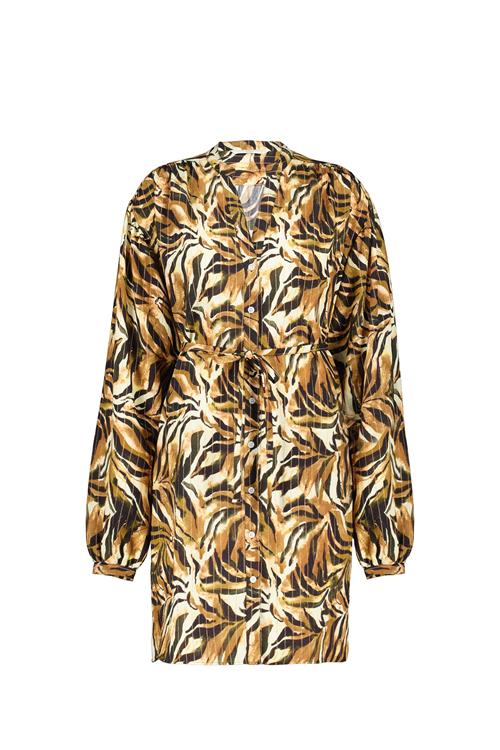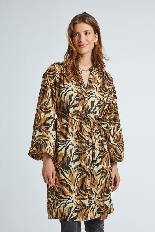 Stijlvol in de Tunic Elga Savanna print De Tunic Elga Savanna print brengt elegantie en verfijning in je kledingkast met zijn unieke zwart/grijze tinten en opvallende print. Deze rechtvallende tuniek heeft een fraaie V-hals en lange mouwen, perfect voor de gezellige herfst- en wintermaanden. Een subtiele knoopsluiting voegt een klassiek accent toe. Het speelse gebruik van lurex zorgt voor een subtiele glans, waardoor je outfit een vleugje glamour krijgt. Gemaakt van hoogwaardige stof De mix van 81% viscose, 17% nylon en 2% metallic yarn maakt deze tuniek een comfortabele keuze die heerlijk aanvoelt op de huid. De viscose biedt zachtheid en soepelheid, terwijl de nylonvezels zorgen voor stevigheid en duurzaamheid. De toevoeging van metallic yarn geeft een lichte, verfijnde glans, zonder dat het kledingstuk zwaar aanvoelt. Stijladvies Combineer de Tunic Elga Savanna print met een paar elegante laarzen of stijlvolle enkellaarzen voor een complete look. Voor een warme en modieuze outfit voeg je een panty of legging toe. Deze tuniek is veelzijdig genoeg om overdag te dragen, maar ook geschikt voor een avondje uit. Wasvoorschrift Wasinstructie: Was de tuniek op 30 graden om de stof en de print mooi te houden. Vermijd het gebruik van bleekmiddelen. Droogvoorschrift: Hang de tuniek na het wassen op om te drogen. Dit helpt om kreukels te minimaliseren en behoudt de pasvorm. Strijkvoorschrift: Strijk indien nodig op een lage temperatuur om de delicate stof en glans te behouden. Met de Tunic Elga Savanna print maak je een stijlvolle keuze die zowel tijdloos als trendy is.