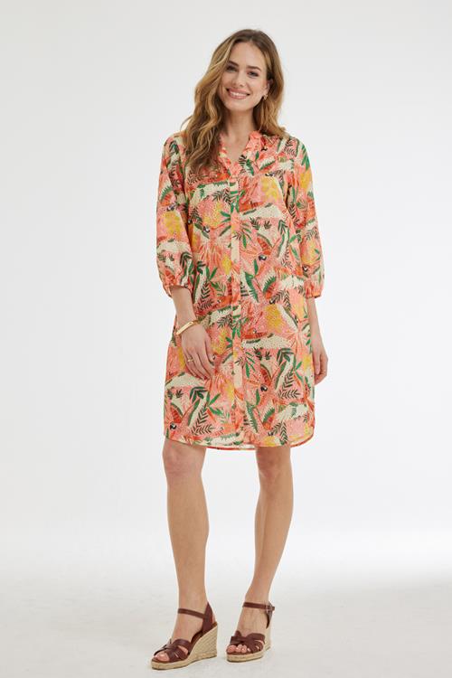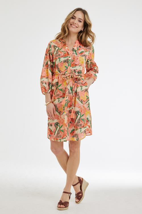 Tunic Mel Palooza Print: Jouw Kleurrijke Eyecatcher De Tunic Mel Palooza print verleidt je met zijn levendige geel/oranje tinten en speelse dessins. Deze tuniek met print straalt vrolijkheid uit en is perfect voor de zonnige dagen. De lange mouwen en de rechte pasvorm geven het kledingstuk een stijlvolle uitstraling, terwijl de V-hals en knoopsluiting zorgen voor een moderne twist. Het subtiele taillekoordje voegt een verfijnd accent toe, waardoor je look helemaal af is. Gemaakt van Hoogwaardige Stof Deze tuniek is vervaardigd uit 100% polyester, een stof die bekendstaat om zijn lichtgewicht en duurzame eigenschappen. Polyester houdt zijn vorm goed vast, zelfs na meerdere wasbeurten, en biedt kreukvrij draagcomfort, ideaal voor de drukke dagen. De stof voelt zacht aan op de huid en droogt snel, waardoor het perfect is voor het warme seizoen. Stijladvies Combineer de Tunic Mel Palooza print met sandalen of espadrilles voor een casual en luchtige look. Voeg een opvallende armband of oorbellen toe als accessoires voor een extra touch. Deze tuniek kan zowel als jurk als over een lichte broek gedragen worden, voor een veelzijdige garderobe-optie. Wasvoorschrift Wassen: Voor het beste onderhoud was je de tuniek op 30 graden. Dit helpt de heldere kleuren en de vorm van het kledingstuk te behouden. Droogvoorschrift: Niet geschikt voor de droger. Laat de tuniek aan de lucht drogen om de stof in topconditie te houden. Strijkvoorschrift: Strijken kan op lage temperatuur. Dit zorgt ervoor dat de tuniek zijn vorm behoudt zonder de stof te beschadigen. Met deze kleurrijke tuniek ben je helemaal klaar voor de zonnige dagen vol plezier en stijl!