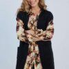 Tuniek Jolie Black Blooming print: Jouw Perfecte Herfstmust-have Maak kennis met de Tuniek Jolie Black Blooming print, het ultieme kledingstuk dat je herfstgarderobe compleet maakt. Met zijn klassieke kraag en elegante zwarte en grijze bloemenprint straalt deze tuniek tijdloze stijl uit. De rechte pasvorm en lange mouwen bieden precies de juiste combinatie van comfort en verfijning. De knoopsluiting maakt deze tuniek veelzijdig, perfect voor elke gelegenheid, van ontspannen dagen tot gezellige avonden. Gemaakt van hoogwaardige stof Deze tuniek is vervaardigd van 100% viscose, een stof die bekendstaat om zijn zachte en lichte eigenschappen. Het ademende materiaal zorgt ervoor dat je je de hele dag fris en comfortabel voelt, ongeacht de activiteiten op je agenda. De kwaliteit van viscose maakt de tuniek niet alleen duurzaam, maar ook elegant vallend en heerlijk om te dragen. Stijladvies De Tuniek Jolie Black Blooming print is een veelzijdige toevoeging aan je kledingkast. Combineer hem moeiteloos met een lekkere broek of een stijlvolle jeans voor een casual look die altijd in de mode is. Of je nu een dagje uit plant of een avondje uitgaat, met deze tuniek maak je altijd een statement. Wasvoorschrift Wasvoorschrift: Was de tuniek op een fijne wascyclus bij maximaal 30 graden om de kwaliteit van de viscose te behouden. Droogvoorschrift: Laat de tuniek liggend drogen om vormverlies te voorkomen en de print in optimale staat te houden. Strijkvoorschrift: Strijk de tuniek op lage temperatuur. Vermijd direct contact met de print om beschadiging te voorkomen. Met de Tuniek Jolie Black Blooming print voeg je een vleugje elegantie en comfort toe aan je dagelijkse outfits. Perfect voor het seizoen waarin je je zowel warm als stijlvol wilt voelen!