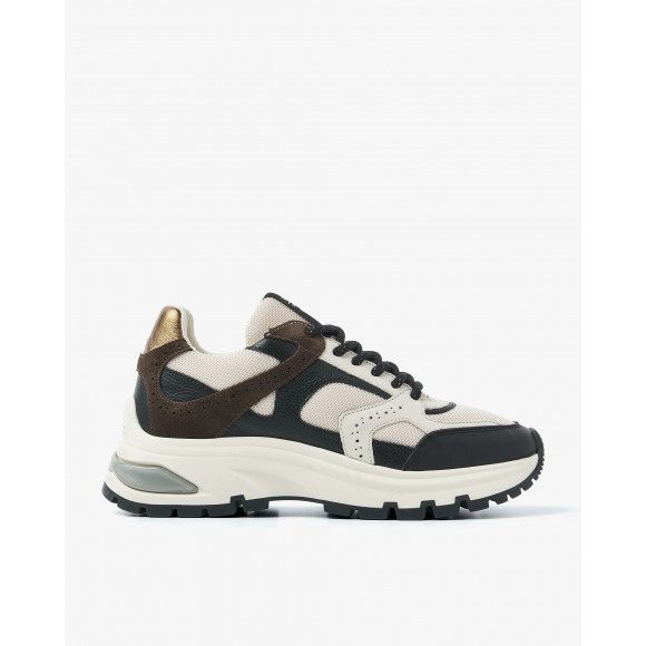 Sneaker van het merk Via Vai. Deze sportieve, chunky sneakers combineren beige mesh met zwart en bruin leer en suède, aangevuld met een metallic goud accent op de hiel. De grove zool met stoer profiel zorgt voor comfort én een trendy uitstraling.