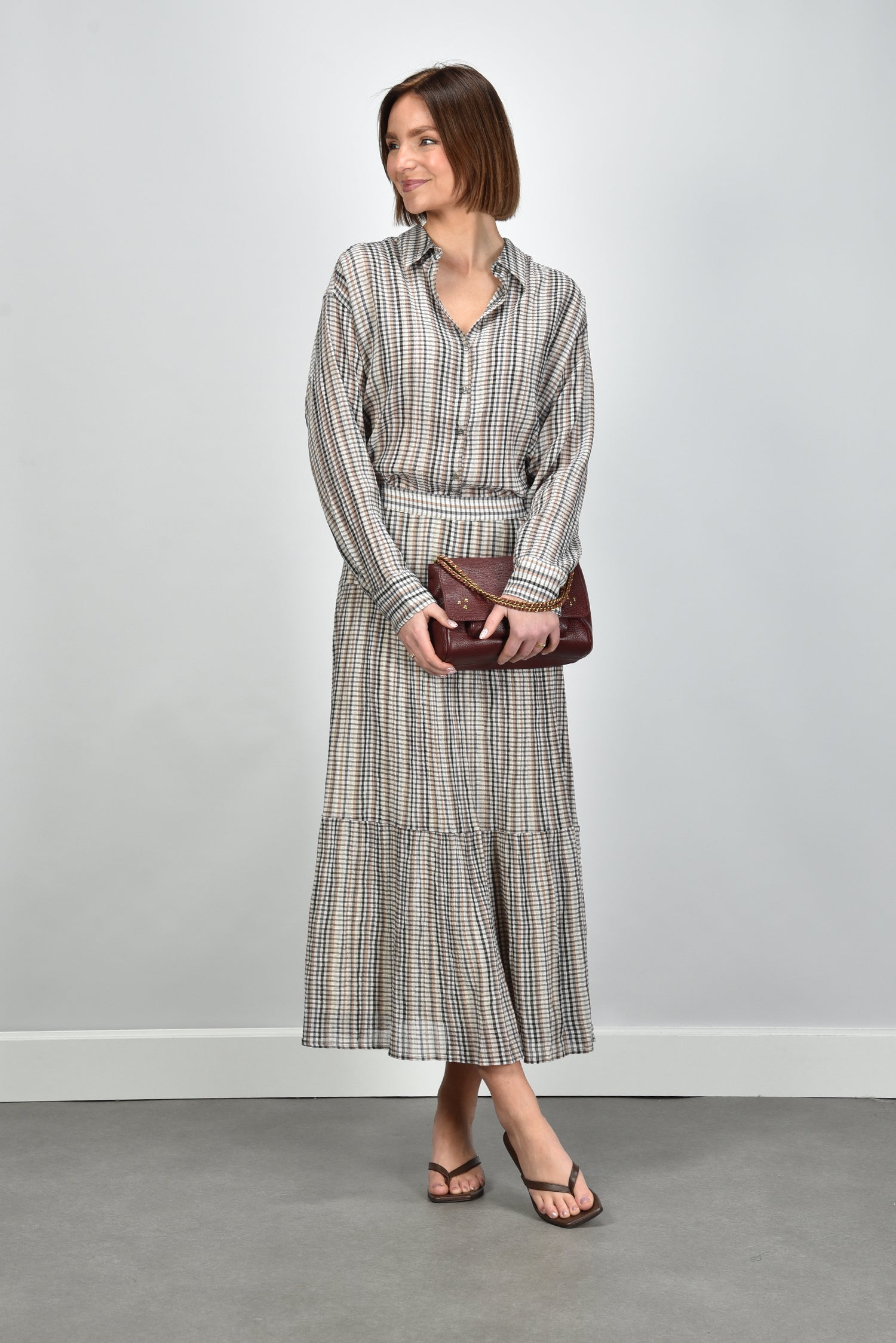 De rok Alexia van Xirena heeft dat typische ontspannen karakter waar het label om bekendstaat. De midi rok valt soepel tot op de enkels en is gemaakt van 100% katoen, waardoor hij licht draagt en prettig aanvoelt. Het geruite patroon in zachte tinten geeft de stof extra diepte. De elastische tailleband zorgt voor een comfortabele pasvorm die mooi aansluit zonder te knellen. Onderaan loopt de rok iets uit met een subtiele plooi, wat het geheel een vloeiend effect geeft bij elke stap. Mooi te combineren met een luchtige blouse of de Toral sandalen TL ROCIO in coffee brown voor een casual, verzorgde look.