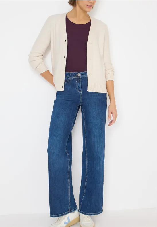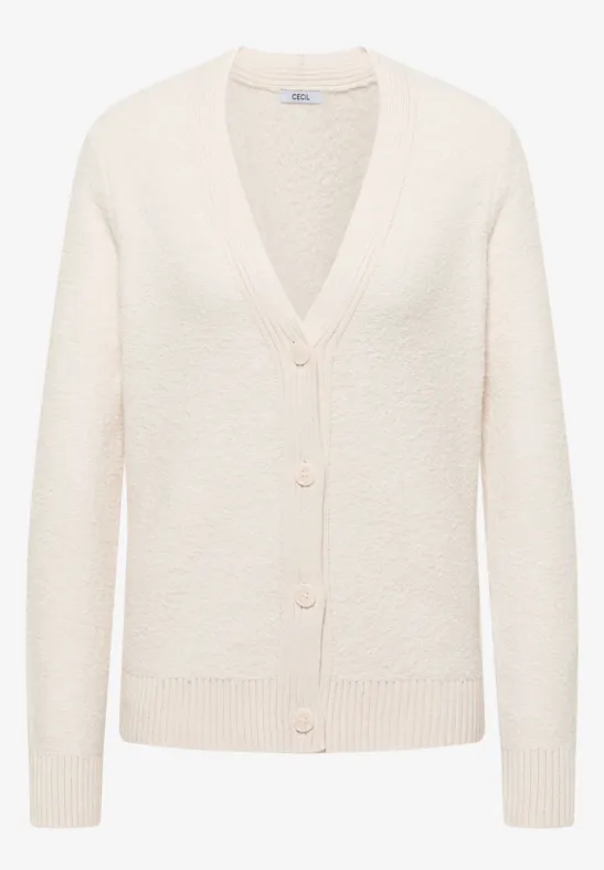 Dit damesvest van CECIL heeft een zachte bouclétextuur en voelt bijzonder behaaglijk aan. De V-hals, de doorlopende knoopsluiting en de lange mouwen met geribde boorden geven het vest een klassieke look en een behaaglijke pasvorm. Een perfecte keuze voor ontspannen outfits met stijl.