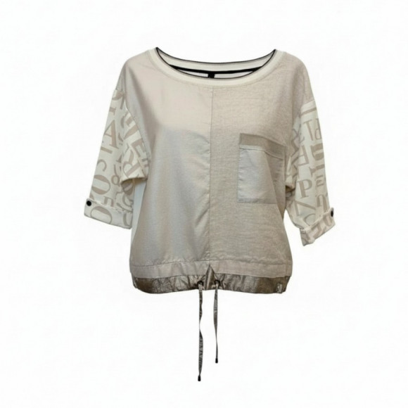 Top van Zip73. Deze eigentijdse top in een zachte zandkleur combineert verschillende materialen en structuren voor een speelse, moderne uitstraling. De mix van gladde stof en een subtiel grafisch letterdessin op de mouwen geeft het item karakter, terwijl de relaxte pasvorm zorgt voor optimaal draagcomfort. Het aantrekkoord aan de onderzijde maakt de top veelzijdig en makkelijk naar wens te stylen.