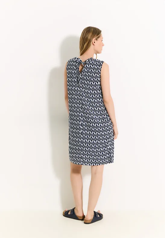 Deze knielange zomerjurk van CECIL voor dames met zijn leuke print is ideaal voor warme dagen. De V-hals met knooppas geeft de jurk een elegant tintje. De enigszins klokkende mouwen en lichte taillering zorgen voor het vrouwelijke silhouet, terwijl het grafische patroon de jurk een moderne touch geeft.