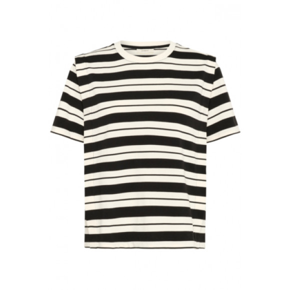 Gestreept T-shirt van het merk InWear. Dit rechtvallende model is gemaakt van een zacht katoen en heeft een ronde hals en korte mouwen. De zwarte en offwhite strepen geven een tijdloze, moderne look.