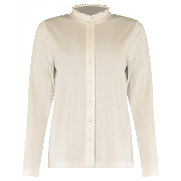 Blouse van Bloomings. Deze elegante blouse met subtiel opstaand kraagje en ruches langs de hals geeft een vrouwelijke touch aan iedere outfit. Het tijdloze ontwerp met knoopsluiting voor en lange mouwen maakt dit item veelzijdig en gemakkelijk te combineren zowel casual als zakelijk.