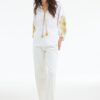 Blouse Jaipur White: Tijdloze Elegantie De Blouse Jaipur White is een perfecte keuze voor een frisse en luchtige stijl. Met zijn rechte pasvorm, lange mouwen en stijlvolle V-hals geeft deze blouse een moderne twist aan je garderobe. De subtiele accentbies op de halslijn en verfijnde borduursels maken het helemaal af. Het is een veelzijdig model dat zich moeiteloos laat combineren met zowel casual als meer formele outfits, ideaal voor zonnige dagen waarin comfort en stijl voorop staan. Gemaakt van hoogwaardige stof Deze blouse is gemaakt van 100% katoen, een materiaal dat bekend staat om zijn ademende en duurzame eigenschappen. Katoen houdt je comfortabel, zelfs op warme dagen, en geeft je de zekerheid van een blouse die na veelvuldig wassen mooi blijft. Dankzij de natuurlijke vezels voelt de stof zacht aan op de huid. De katoenstructuur zorgt ervoor dat de kleuren goed behouden blijven en dat de blouse vormvast is, waardoor je er nog lang plezier van hebt. Stijladvies Of je nu gaat voor een ontspannen look of juist iets gekleder, de Blouse Jaipur White past overal bij. Combineer deze blouse met een lekkere broek of je favoriete jeans voor een ongecompliceerde stijlvolle outfit. De ruches geven de blouse een speels accent terwijl de lange mouwen zorgen voor een elegante uitstraling. Het is de perfecte aanvulling voor elke gelegenheid! Wasvoorschrift Wasvoorschrift: Was de blouse op 30 graden om de stof en kleuren in topconditie te houden. Droogvoorschrift: Niet in de droger om krimp te voorkomen. Strijkvoorschrift: Strijk op lage temperatuur om de stof te beschermen en kreukvrij te maken. Vermijd ook het gebruik van bleekmiddelen en chemische reiniging. Met deze instructies blijft je blouse niet alleen mooi, maar verleng je ook de levensduur van je geliefde kledingstuk. Voeg deze blouse toe aan je collectie en geniet van de perfecte combinatie van stijl en comfort!