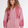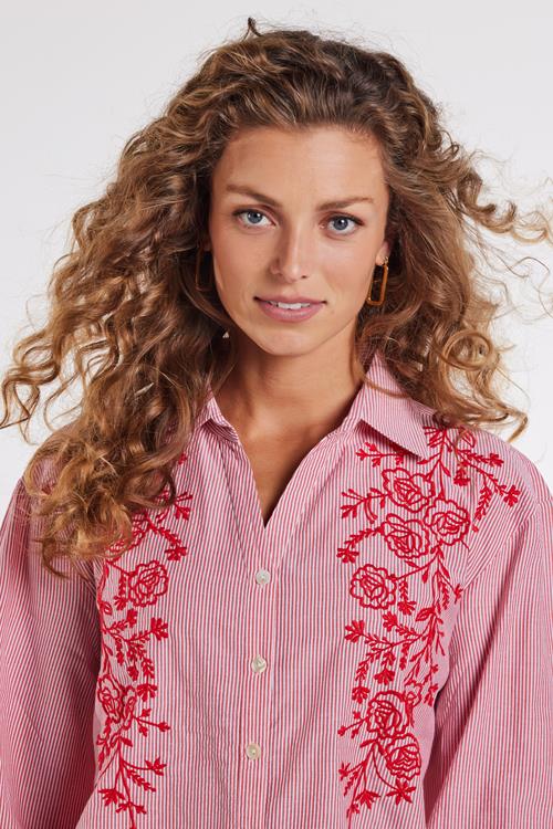 Blouse Marina Red white Stripe: Tijdloos & Elegant De Blouse Marina Red white Stripe belooft een vleugje verfijning en kleur aan je garderobe toe te voegen. Met zijn opvallende rode kleur en klassieke strepen is deze blouse ontworpen om iedere dag een beetje zonniger te maken. Dankzij de lange mouwen met print en het elegante borduurwerk creëert dit kledingstuk een stijlvolle look. De klassieke kraag en de praktische knoopsluiting maken het geheel af, resulterend in een regular fit die comfortabel en recht is. Perfect voor een frisse, vrolijke uitstraling. Gemaakt van hoogwaardige stof De Blouse Marina is vervaardigd uit 100% viscose. Dit materiaal staat bekend om zijn zachte en soepele structuur, waardoor de blouse heerlijk luchtig aanvoelt. Viscose heeft tevens het voordeel dat het goed ademt, wat deze blouse ideaal maakt voor warmere dagen. Met de natuurlijke glans ziet de stof er tevens luxueus uit, zonder dat het onderhoud veel moeite kost. Stijladvies Stijlvol en veelzijdig, de Marina blouse laat zich moeiteloos combineren. Draag deze blouse bijvoorbeeld met een lekkere broek of je favoriete jeans voor een casual-chique look. Voeg accessoires toe om je outfit een persoonlijke touch te geven. Of kies voor eenvoudig comfort met effen schoenen om het borduurwerk te laten spreken. Wasvoorschrift Het wasvoorschrift: Was de blouse op 30 graden om de kwaliteit te behouden. Viscose vereist een zachte behandeling, zodat de stof er lang mooi uit blijft zien. Droogvoorschrift: Vermijd het gebruik van een droger. Laat de blouse aan de lucht drogen voor het beste resultaat. Strijkvoorschrift: Strijk de blouse op lage temperatuur om kreuken glad te strijken en de glans van de stof te behouden. Met deze instructies blijft je Blouse Marina Red white Stripe in topconditie, zodat je er keer op keer van kunt genieten.