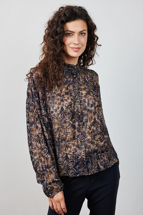Een vleugje luxe met de Blouse Saida in Black glamour print Beeld je een elegante stijlvolle blouse in die zowel verfijnd comfort biedt als een stijlvolle uitstraling. De Blouse Saida in Black glamour print is perfect voor het komende seizoen. Met lange mouwen en een rechte pasvorm biedt deze blouse zowel een klassieke als een moderne uitstraling. De ronde halslijn en de subtiele knoopsluiting voegen een verfijnde touch toe. Deze blouse in zwart met grijze tinten is een prachtige toevoeging aan je garderobe, ideaal voor zowel formele als casual gelegenheden. Gemaakt van hoogwaardige stof De blouse is vervaardigd uit 87% viscose en 13% metaal. Deze hoogwaardige stofsamenstelling geeft je outfit de perfecte balans tussen elegantie en comfort. Viscose zorgt voor een zachte, ademende stof die prettig aanvoelt op de huid, terwijl de metaaldraad een subtiele glans toevoegt die elke outfit een glamour boost geeft. Het materiaal is ideaal voor de koele dagen, terwijl het toch licht aanvoelt en soepel valt. Stijladvies Deze veelzijdige blouse is eenvoudig te combineren voor verschillende looks. Draag het met een lekkere broek of een comfortabele jeans voor een casual maar chique uitstraling. Of combineer het met een stijlvolle rok voor een meer formele gelegenheid. Voeg een paar zilveren accessoires toe om de metallic glans van de blouse extra te benadrukken. Wasvoorschrift Het wasvoorschrift: Was de blouse op een zacht wasprogramma met een maximale temperatuur van 30°C. Gebruik geen bleekmiddelen om de kleuren en de kwaliteit van de stof te behouden. Droogvoorschrift: Laat de blouse op een hanger drogen om de vorm te behouden. Vermijd het gebruik van een droger om krimp of beschadiging te voorkomen. Strijkvoorschrift: Strijk de blouse op een lage temperatuur aan de binnenkant. Vermijd direct contact van het strijkijzer met de metallic delen om het materiaal te beschermen.