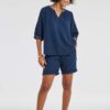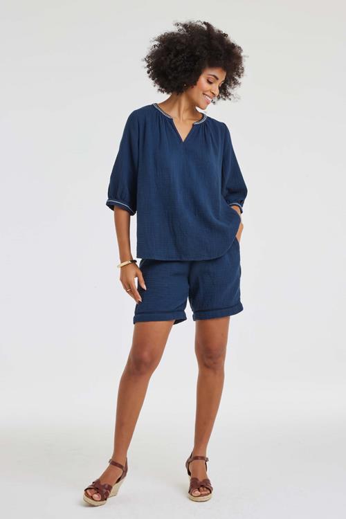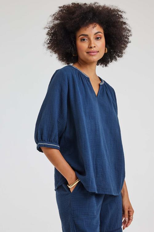 Blouse Salina Dark Blue – Jouw Stijlvolle Metgezel Ontmoet jouw nieuwe favoriet voor de zonnige dagen: de Blouse Salina Dark Blue. Deze prachtige blauwe blouse is een symbool van moeiteloze elegantie. Met een rechte pasvorm, driekwart mouwen en een charmante V-hals, biedt deze blouse alles wat je zoekt in een stijlvol en comfortabel kledingstuk. Perfect voor die momenten wanneer je iets fris en luchtigs nodig hebt. Gemaakt van hoogwaardige stof Onze Blouse Salina Dark Blue is vervaardigd van 100% katoen, wat een zacht en ademend gevoel biedt. Katoen staat bekend om zijn duurzaamheid en comfort, perfect voor casual outings of een dagje op kantoor. Dankzij de natuurlijke stof blijf je koel en comfortabel, zelfs tijdens de warmste dagen. Stijladvies Deze veelzijdige blouse laat zich eenvoudig combineren. Of je nu kiest voor een casual dag met een lekkere broek of een stijlvolle jeans, de Blouse Salina Dark Blue past bij elke look. Voeg een paar leuke accessoires toe, en je bent klaar om te stralen. Wasvoorschrift Wasvoorschrift: Was de blouse op 30 graden om de stof en kleur te behouden. Dit zorgt ervoor dat de blouse langer meegaat en zijn frisse uitstraling behoudt. Droogvoorschrift: Laat de blouse aan de lucht drogen. Dit helpt kreuken verminderen en houdt de stof in optimale conditie. Strijkvoorschrift: Strijk de blouse op een lage temperatuur. Dit zorgt ervoor dat de stof soepel blijft zonder beschadiging. Met de Blouse Salina Dark Blue haal je een stukje stijl en gemak in huis. Perfect voor elke gelegenheid, en altijd klaar om te verrassen.