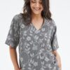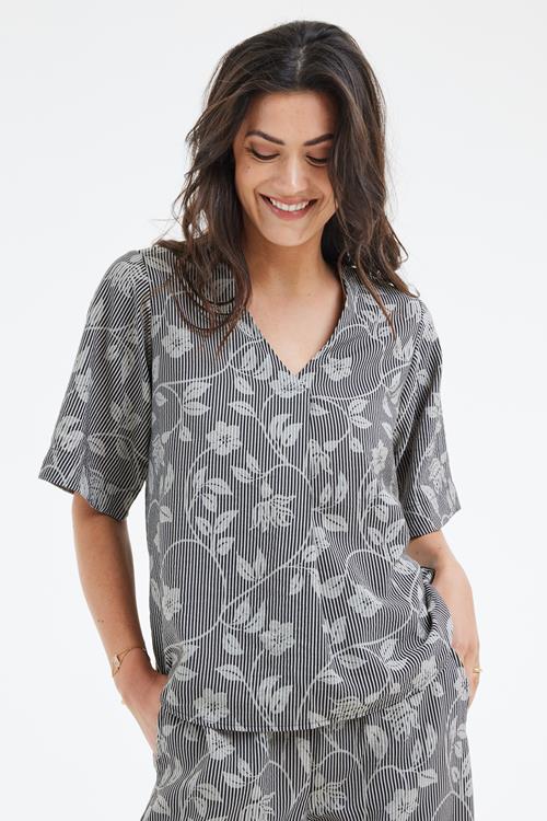 Blouse Tess Bloom print: Jouw Perfecte Zomerse Keuze Ervaar de luchtige frisheid van de Blouse Tess Bloom print. Deze prachtige blouse combineert een stijlvol zwart/grijs bloemenpatroon met een recht model en korte mouwen die je perfect koel houden op zonnige dagen. De flatterende V-hals en hoogwaardige constructie maken deze blouse tot een veelzijdige favoriet voor elke gelegenheid. Kies voor de Blouse Tess Bloom print en geniet van het ultieme comfort en de moeiteloze stijl die je look een frisse kick geeft. Gemaakt van hoogwaardige stof De Blouse Tess Bloom print is vervaardigd uit een blend van 87% Rayon en 13% Nylon. Deze materialen bieden niet alleen een uitzonderlijk draagcomfort, maar zorgen er ook voor dat de blouse zacht aanvoelt op je huid. Dankzij de ademende en lichte eigenschappen van Rayon, blijft de stof koel, zelfs op de warmste dagen. De toevoeging van Nylon zorgt voor extra duurzaamheid en een mooie vloeiende val. Stijladvies De Blouse Tess Bloom print is een veelzijdig stuk dat gemakkelijk te combineren is met verschillende stijlen. Draag het met een lekkere broek of een casual jeans voor een stijlvolle en toch relaxte look. De subtiele print en tijdloze kleuren maken deze blouse een geweldige aanvulling op je dagelijkse garderobe. Wasvoorschrift Het wasvoorschrift: Was de blouse op 30 graden om de kleuren en het materiaal in perfecte staat te houden. Gebruik geen bleekmiddel en vermijd chemisch reinigen. Droogvoorschrift: Hang de blouse op om te drogen. Stop het niet in de droger om de stof in optimale conditie te houden. Strijkvoorschrift: Strijk de blouse op een lage temperatuur om de soepelheid van de stof te behouden. Met deze comfortabele en stijlvolle blouse ben je klaar voor elke zomerse dag!