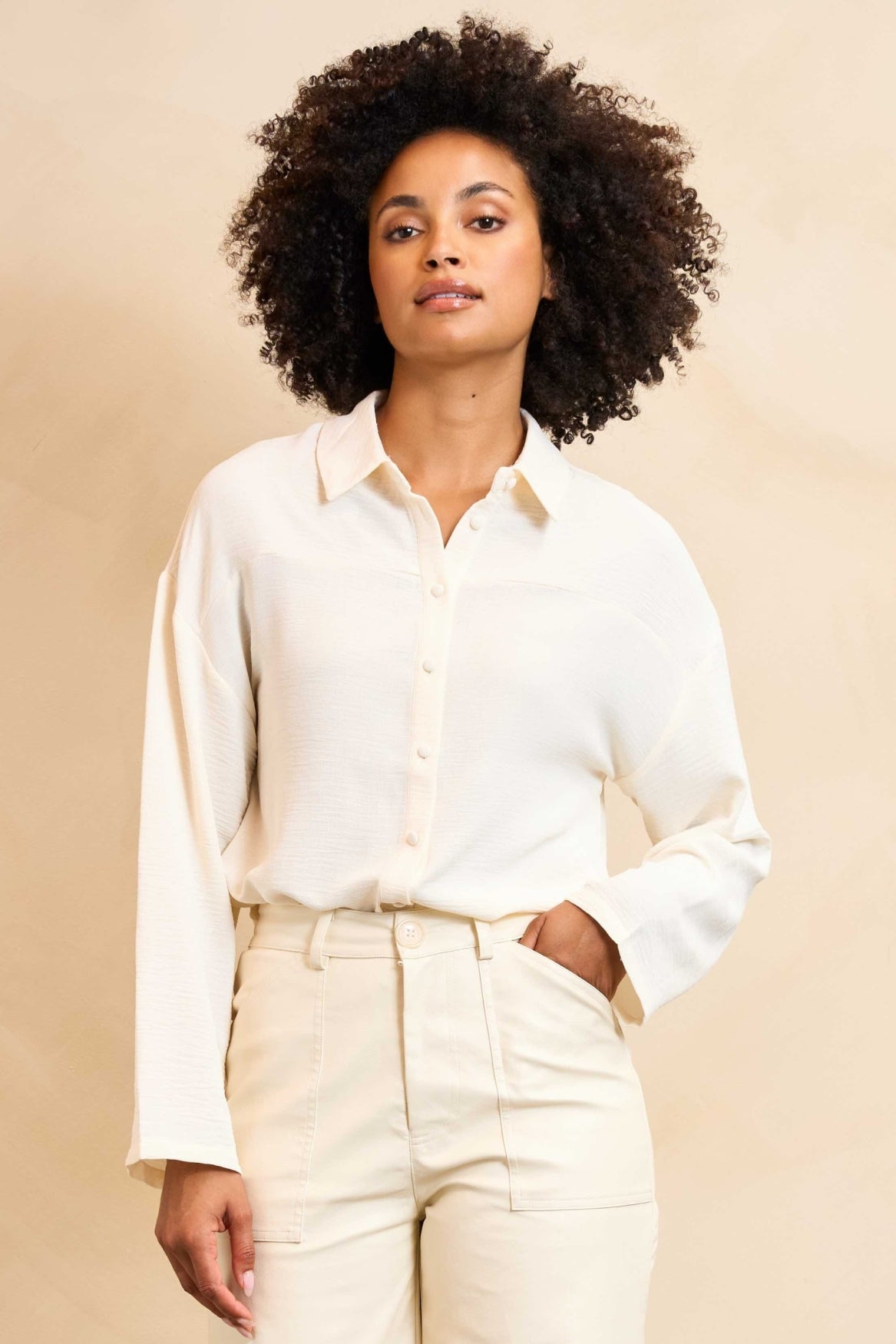 Blouse Tova is een ecru blouse met V-hals en lange mouwen. De subtiele pofmouwen met een elastisch mouwuiteinde geven een verfijnde look. De losvallende pasvorm maakt dit item makkelijk te combineren voor elke dag. Materiaal: 100% polyester Model en fit: losvallend. Het model is 1.74 m en draagt maat S. Lengte blouse: 61 cm bij maat S