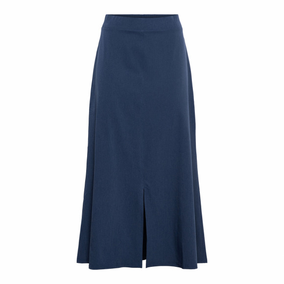 Deze lange rok van &Co is gemaakt van travelstof in navy/jeansblauw melange. De rok heeft een split midden voor en is voorzien van een elastische boord.