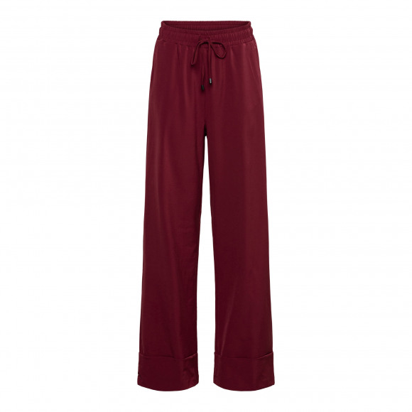 Wide leg pantalon van &Co Woman in een rijke bordeauxrode kleur. Deze broek combineert een elegante uitstraling met ultiem comfort. De elastische tailleband met strikceintuur zorgt voor een mooie pasvorm, terwijl de wijde pijpen en omslag aan de zoom de pantalon een moderne, luchtige look geven.