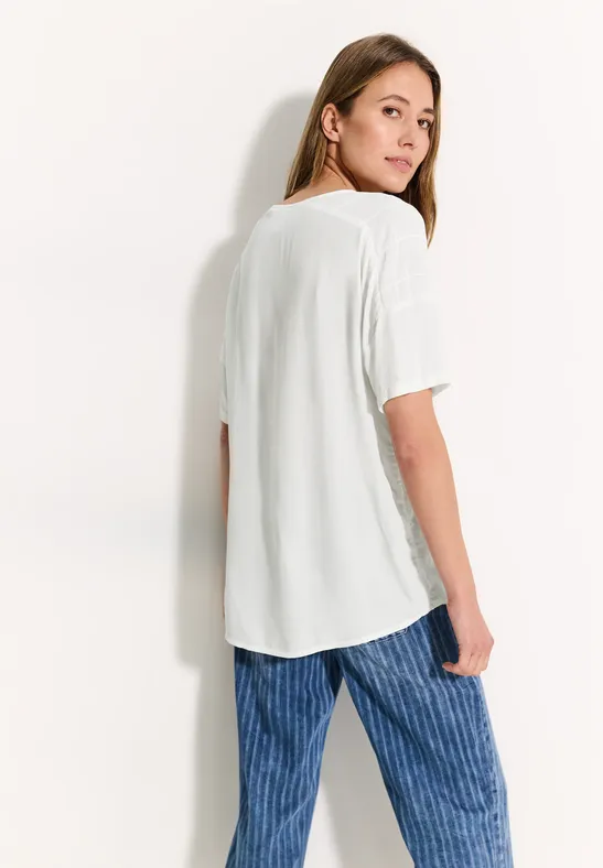 Met zijn fijne crêpestructuur en zachte viscose heeft deze blouse van CECIL een stijlvolle en ongecompliceerde look. De gespleten hals met bandjes en de afgeronde zoom geven hem een vrouwelijke look. Lichtgewicht lange mouwen voor je alledaagse stijl.