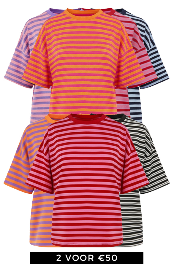 Shop bij Jurkjes.com exclusieve deals! De leukste items voor een MEGA voordelige prijs! Bestel jij deze deal? Dan ontvang je deze items met korting: – Striped T-Shirt Cotton Tricolore t.w.v. €27,99 – Striped T-Shirt Cotton Lila Roze t.w.v. €27,99 – Striped T-Shirt Cotton Black t.w.v. €27,99 – Striped T-Shirt Cotton Navy Baby Blue t.w.v. €27,99 – Striped T-Shirt Cotton Lila Orange t.w.v. €27,99 – Striped T-Shirt Cotton Fuchsia Orange t.w.v. €27,99 – Striped T-Shirt Cotton Fuchsia Roze t.w.v. €27,99 Normaal shop je deze items voor €55,98 NU voor €50,00 ! Maten: ONE SIZE, geschikt voor dames met de maten S(36), M(38), L(40)Pasvorm: Valt als normaalModel: 178 cm en draagt maat One SizeDetails: Ronde hals, korte mouwen, gestreept patroonMateriaal: 25% polyester, 5% elastaan, 70% katoenWasadvies: 30 graden handwasVoor de beste resultaten: Niet in de droger, geen wasverzachter