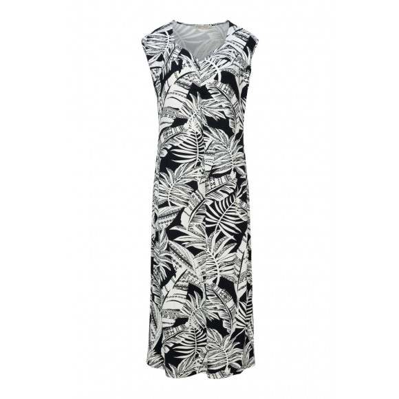 Lange zomerjurk van het merk Dreamstar. Deze jurk is mouwloos, heeft een allover bladprint en een v-halsje.