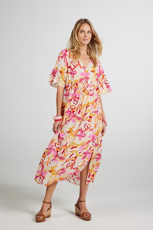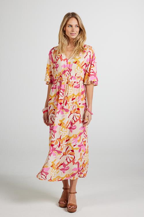 Dress Amour Magnolia Print: Luchtig en Verfijnd Breng een vleugje elegantie in je garderobe met de Dress Amour Magnolia print. Deze jurk, in een frisse witte tint, is ideaal voor zonnige dagen en heldere avonden. Met een V-hals, korte mouwen en een split, straalt het een ontspannen gevoel uit zonder in te boeten aan stijl. Het rechte model met een regular fit zorgt voor een comfortabele pasvorm, en het taillekoordje geeft je de optie om je look naar wens aan te passen. Gemaakt van hoogwaardige stof De Dress Amour Magnolia print is vervaardigd uit 100% Modal, een stof die bekend staat om zijn uitzonderlijke zachtheid en soepelheid. Het ademende karakter van deze stof maakt het perfect voor warme dagen, terwijl de duurzaamheid ervan zorgt voor een lange levensduur. Modal kreukt minder snel en behoudt zijn vorm, zelfs na meerdere wasbeurten, waardoor je er steeds verzorgd uitziet. Stijladvies Deze jurk is veelzijdig en kan op verschillende manieren gestyled worden. Combineer met sandalen voor een informele brunch, of voeg eenvoudige sieraden en hakken toe voor een avondje uit. De levendige print en het luchtige ontwerp maken het tot een onmisbaar stuk voor al je zonnige momenten. Wasvoorschrift Wassen: Voor het behoud van de kwaliteit en kleur, was de jurk op 30 graden. Droogvoorschrift: Droog de jurk bij voorkeur plat en vermijd de droger om krimp te voorkomen. Strijkvoorschrift: Wil je eventuele kreukels gladstrijken, doe dit dan op een lage temperatuur. De Dress Amour Magnolia print biedt een perfecte balans tussen comfort en stijl, gemaakt voor die heerlijke zonnige dagen waarin je niets liever wilt dan er goed uitzien met minimale inspanning.