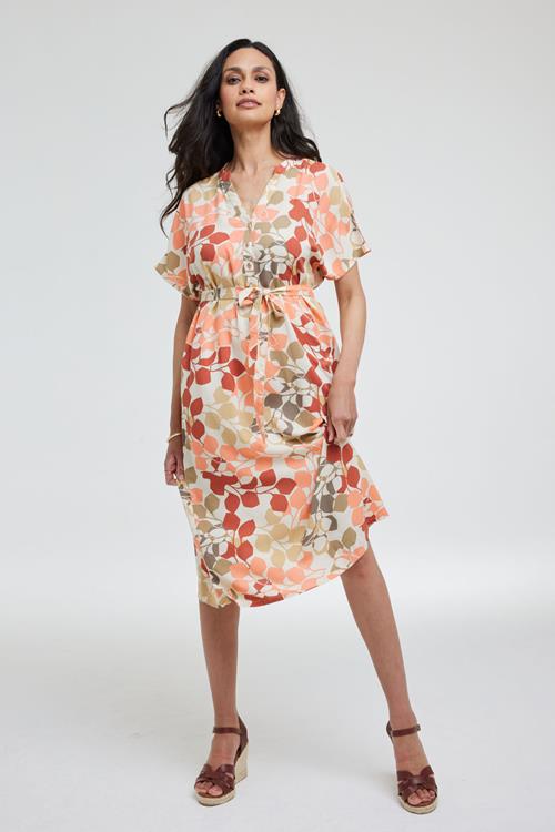 Dress Mauro Bright leaves print Stel je voor dat je op een zonnige dag de deur uitstapt in de Dress Mauro Bright leaves print. Deze jurk, met zijn frisse beige en bruine tinten, straalt energie uit met zijn levendige print. De korte mouwen en rechte pasvorm maken het perfect voor een luchtige en comfortabele look. Met een stijlvolle V-hals en een ceintuur met riemlussen, kun je de jurk eenvoudig aanpassen aan jouw voorkeur. De subtiele split voegt een speelse flair toe, waardoor deze jurk je nieuwe favoriet voor zonnige dagen wordt. Gemaakt van hoogwaardige stof De Dress Mauro Bright leaves print is gemaakt van 100% viscose. Deze natuurlijke en ademende stof voelt zijdezacht aan op je huid en biedt optimaal draagcomfort. Viscose is licht van gewicht en valt soepel en elegant, waardoor het een uitstekende keuze is voor warme dagen. De stof houdt je fris, zelfs tijdens de warmste momenten. Stijladvies Combineer deze veelzijdige jurk met een paar sandalen en subtiele sieraden voor een dagelijkse look. Wil je een avondje uit? Voeg dan een elegante clutch en je favoriete paar hakken toe. Het ceintuur accentueert je taille en geeft een extra accent aan je silhouet. Wasvoorschrift Wassen De jurk kan het beste gewassen worden op 30 graden om de kwaliteit van de viscose te behouden. Droogvoorschrift Vermijd het gebruik van de droger; laat de jurk liever aan de lucht drogen om de vezels te beschermen. Strijkvoorschrift Strijk de jurk op een lage temperatuur om de stof glad en netjes te houden. Geniet van het gemak en de stijlvolle uitstraling van de Dress Mauro Bright leaves print en maak van elke zonnige dag een modieuze belevenis.