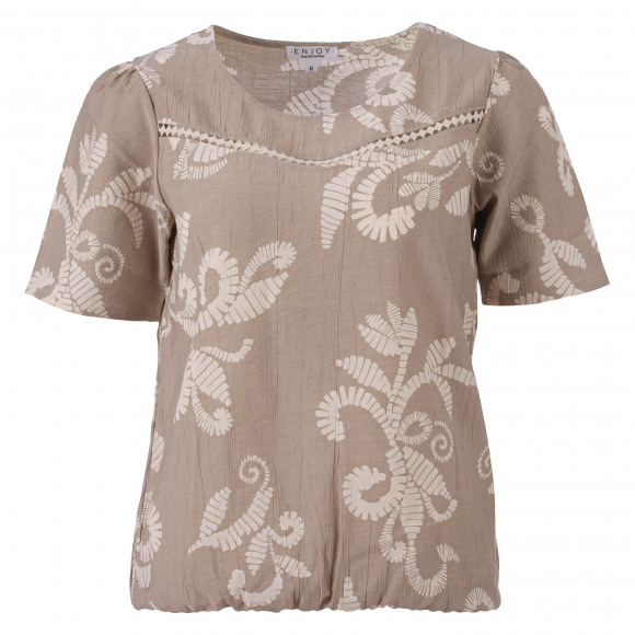 Blouson met allover print van het merk Enjoy. Deze blouson heeft een ronde hals, korte mouwen, elastiekje onderin de boord en een gehaakt detail op het voorpand. We hebben deze blouson in 2 verschillende kleuren.