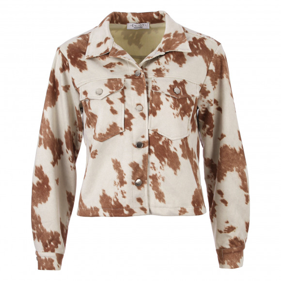 Boxy suedine jasje van het merk Enjoy. Dit jasje heeft een heel leuk allover koeienprint. Koeienprint is de nieuwe panterprint!