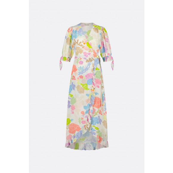 Overslag jurk met allover print van het merk Fabienne Chapot. Deze jurk heeft een korte pofmouw met koordjes en een roesel langs de zoom van de jurk.