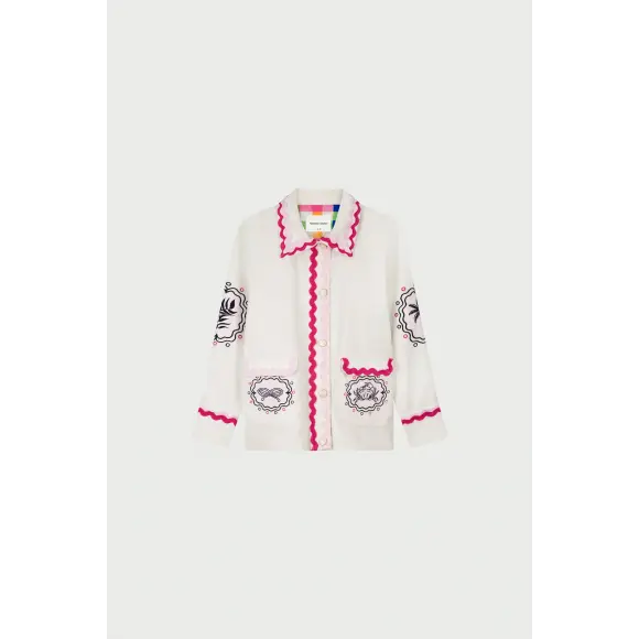 Jasje van Fabienne Chapot met een speelse en uitgesproken uitstraling. De frisse off-white kleur vormt een mooi contrast met de felroze zigzagbiezen langs de kraag, sluiting en zakken. De geborduurde details op de mouwen en zakken geven het jasje een artistiek en herkenbaar Fabienne Chapot karakter. Het rechte model en de stevige stof maken dit jasje perfect als opvallende finishing touch voor je outfit.