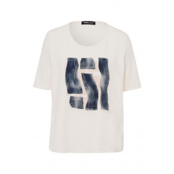 T-shirt met frontprint van het merk Frank Walder. Dit model in offwhite heeft een ronde hals, korte mouwen en een rechtvallende pasvorm. De voorkant is voorzien van een abstracte print in blauw en beigetinten, afgewerkt met subtiele strass steentjes voor een vleugje glans. Gemaakt van een zachte en soepele stof die comfortabel draagt.