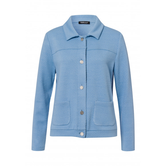 Jasje van het merk Frank Walder. Dit lichtblauwe jasje is uitgevoerd in een subtiel gestructureerde stof die zorgt voor een speelse maar elegante uitstraling. Het model heeft een klassieke kraag, lange mouwen en een knoopsluiting met stijlvolle, ronde knopen. De opgestikte zakken aan de voorzijde geven het geheel een casual touch, terwijl de getailleerde pasvorm voor een mooi silhouet zorgt.