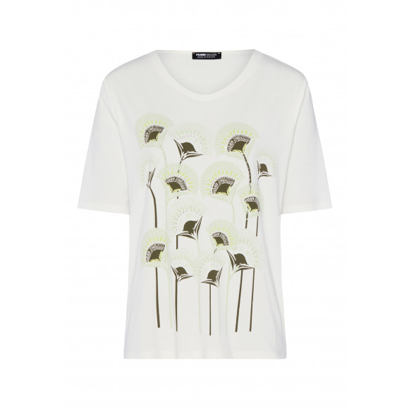 T-shirt van het merk Frank Walder. Dit stijlvolle T-shirt heeft een frisse en vrouwelijke uitstraling dankzij de subtiele bloemenprint op de voorkant in zachte groentinten en taupe. De ronde hals en de soepelvallende kwaliteit zorgen voor een comfortabele pasvorm, terwijl de decoratieve steentjes in de print een elegante touch geven. Een veelzijdig item dat gemakkelijk te combineren is voor zowel een casual als een nette look.