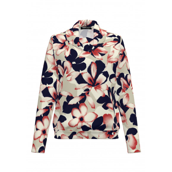 Top van Frank Walder. Deze fleurige top met colkraag straalt comfort en elegantie uit. De soepele stof met bloemendessin in zachte tinten van crème, roze en navy voelt aangenaam aan en beweegt mooi met je mee. De colkraag geeft het model een moderne twist, terwijl de elastische zoom zorgt voor een subtiel blousend effect.