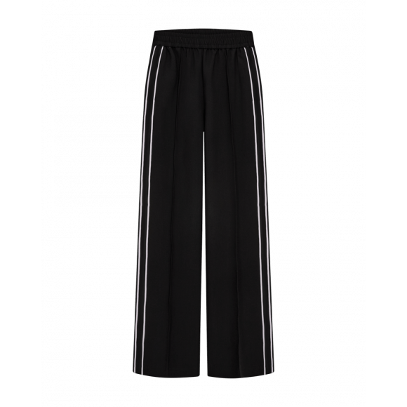 Losvallende broek van Freequent met een sportieve uitstraling. Het model heeft een comfortabele elastische tailleband en is afgewerkt met contrasterende strepen langs de zijkant. Verkrijgbaar in zwart met offwhite details en port royale met zwart witte details.