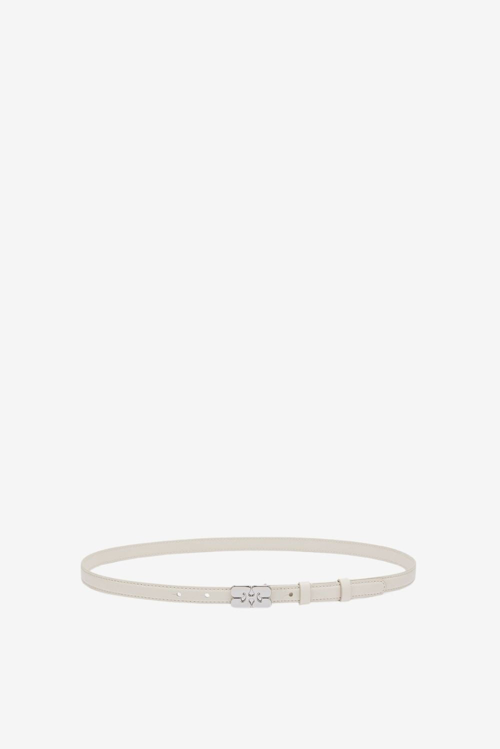 Hier zie je de riem A7069 van Ganni, een smalle riem in zacht egret die bijna wit oogt. De vorm is strak en minimalistisch, waardoor de zilverkleurige gesp direct opvalt. Die gesp heeft een subtiel ingegraveerd motief dat de riem een duidelijk karakter geeft zonder dat het overheerst. Het gerecyclede leer voelt stevig en licht tegelijk, prettig voor dagelijks gebruik. Het past bij de speelse blik van Ganni op mode, met aandacht voor vorm en kleine verrassingen in de afwerking.