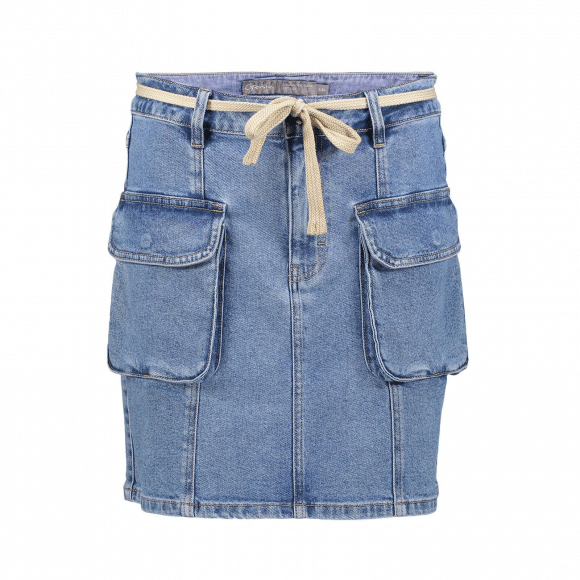 Super leuke korte cargo jeans rok van het merk Geisha. Deze rok valt qua lengte boven de knie, heeft een rits en knoopsluiting en een koordje in de boord.