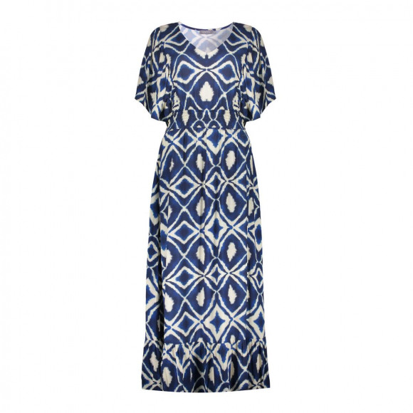 Jurk van Geisha met een opvallende blauw-witte print die zorgt voor een frisse en zomerse uitstraling. Dit lange model heeft een vrouwelijke V-hals en korte, losvallende mouwen die het geheel een luchtige look geven. De elastische tailleband benadrukt het silhouet, terwijl de soepel vallende rok met een subtiele volant aan de onderkant zorgt voor extra beweging.