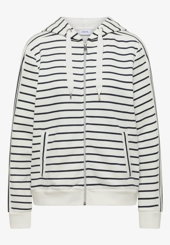 Dit gestreepte jack met capuchon van CECIL voor dames heeft een comfortabele en casual stijl. Het gestreepte patroon geeft het sweatjack een frisse look om elke dag te dragen. De capuchon met trekkoord en zijzakken zorgen voor praktische details. Perfect voor ongecompliceerde casual looks met een feel good-factor.