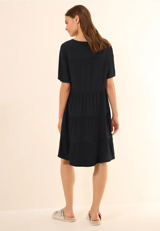 Deze gestructureerde jurk met volants van CECIL voor dames is een ongecompliceerde essential voor je zomergarderobe. De fijne textuur geeft de knielange zomerjurk een bijzondere flair, terwijl korte mouwen en een split in de hals de look een modieuze finishing touch geven. De viscosemix met stretch zorgt voor een hoog draagcomfort.