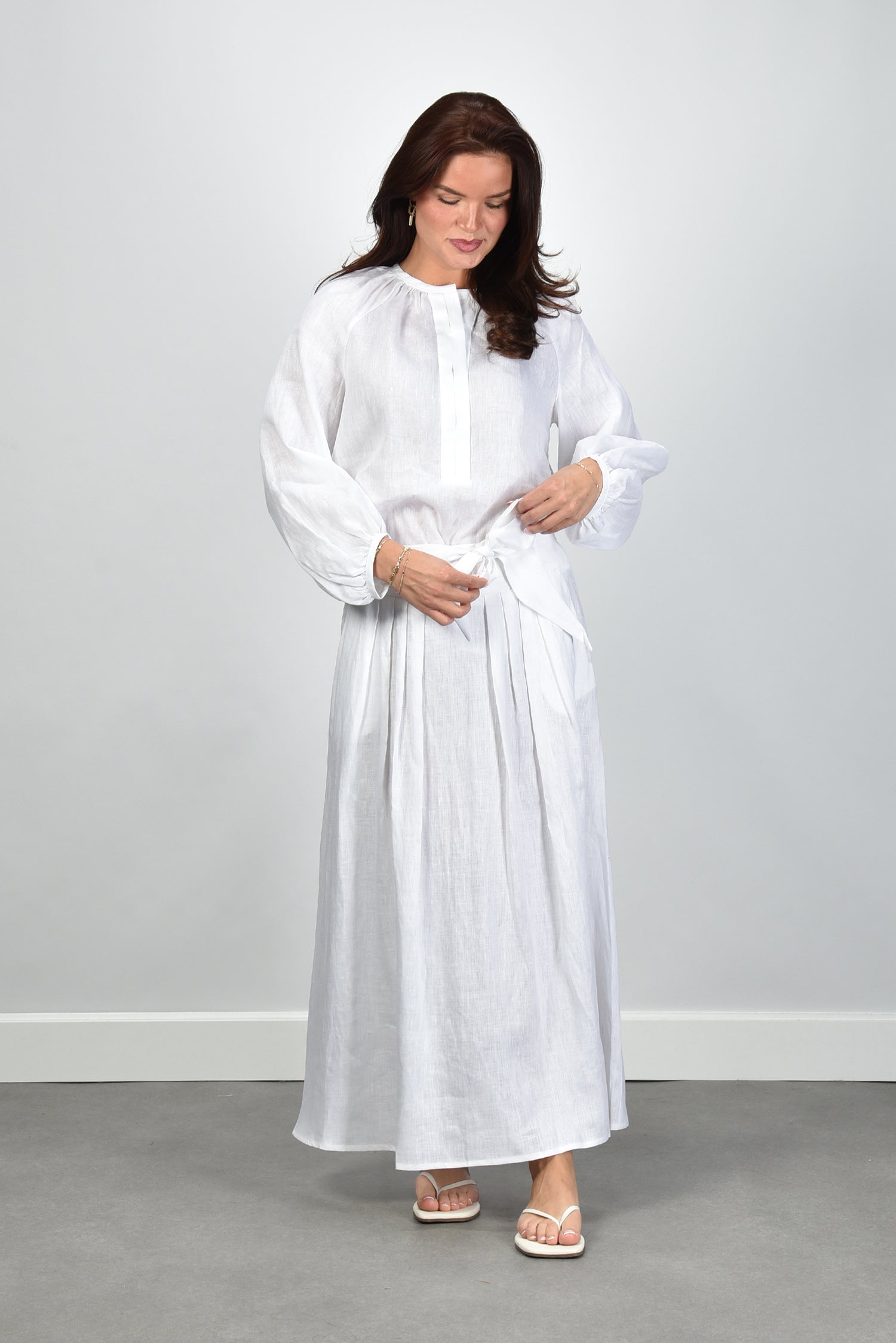 De maxi rok met strikceintuur van Greek Archaic Kori heeft de kenmerkende luchtige gratie van het merk. Gemaakt van 100 procent linnen, waardoor de stof mooi valt en soepel draagt. De rok heeft een hoge taille met een brede ceintuur die je elegant kunt knopen op de manier die jij prettig vindt. De plooien vanuit de taille geven de witte stof extra diepte en vorm, terwijl de steekzakken een nonchalant detail toevoegen. Draag de rok samen met de Greek Archaic Kori blouse S26K-1004087 white voor een rustige, zonnige look. De rok valt normaal op maat, dus je kunt gewoon je gebruikelijke maat kiezen.