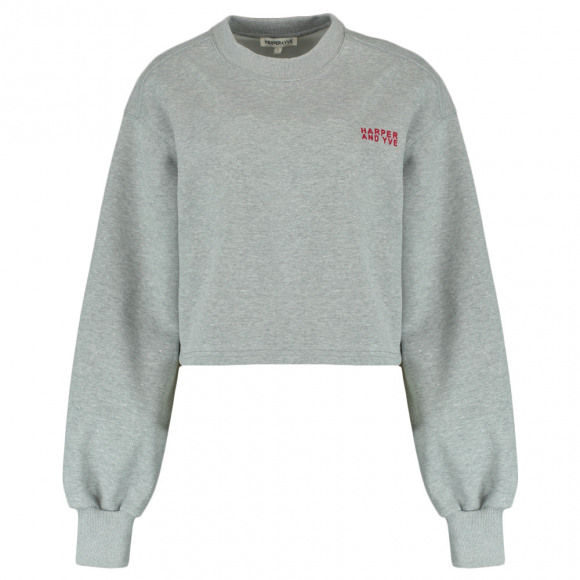Sweater van Harper & Yve. Deze grijze cropped sweater is een sportieve en trendy toevoeging aan je garderobe. Gemaakt van een zachte katoenmix voor optimaal draagcomfort en afgewerkt met een subtiel rood merklogo op de borst. Perfect voor een relaxte, maar toch modieuze look.