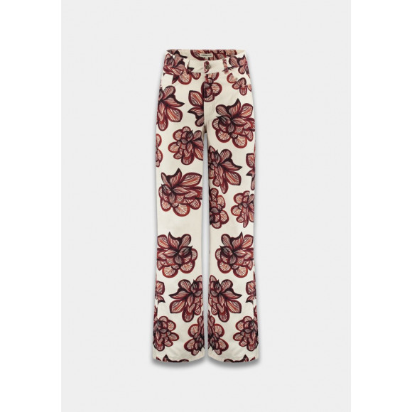 Broek van Harper & Yve. Deze opvallende broek is een echte statement piece dankzij de rijke bloemenprint in warme rood- en bordeaux tinten op een lichte basis. Het model heeft een flatterende high waist en een wijde pijp, waardoor de broek super vrouwelijk valt én heerlijk comfortabel draagt. Perfect voor een trendy set met het bijpassende jasje of top, maar ook prachtig te combineren met een rustige basic.