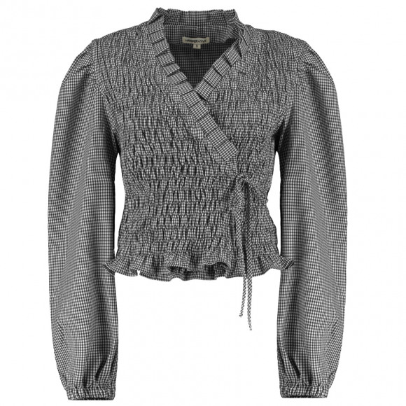 Blouse van Harper & Yve. Deze zwart-wit geruite blouse met wikkel effect en gesmockte details is een vrouwelijke en trendy toevoeging aan je garderobe. De elastische taille en subtiele ruches geven de blouse een speelse touch, terwijl de lange mouwen zorgen voor een elegante uitstraling.