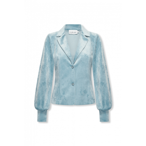 Blazer van het merk Helena Hart in een lichtblauwe veloursstof. Dit model heeft een licht getailleerde pasvorm en is single-breasted met twee knopen aan de voorkant. De blazer is voorzien van een klassieke reverskraag en lange mouwen met brede manchetten, wat zorgt voor een elegante uitstraling. De zachte veloursstof geeft het geheel een luxe en comfortabele look.